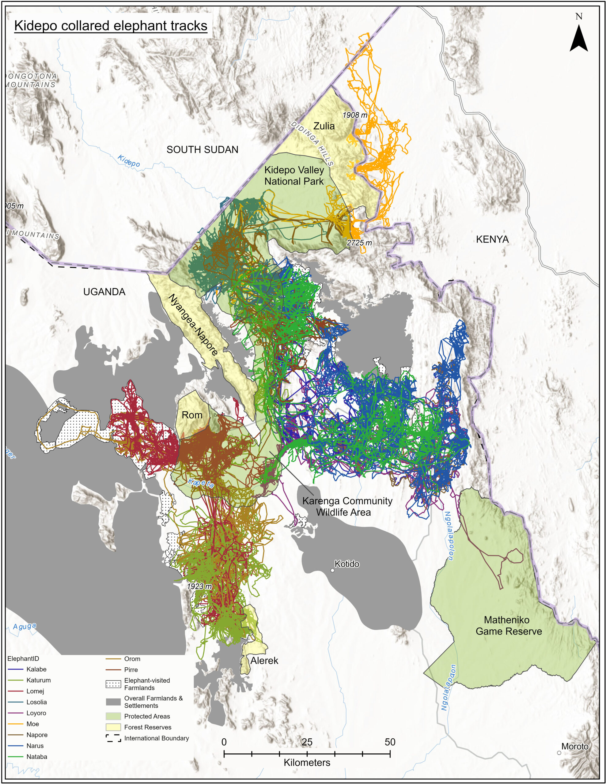 Straddling Uganda’s northeast, South Sudan’s southern, and Kenya’s northwest borders, the Kidepo landscape is a mosaic of community rangelands, farmlands, and protected areas including the Kidepo Valley National Park (KVNP), Karenga Community Wildlife Area (KCWA), and protected forest reserves. Elephants here navigate a multiuse landscape consisting of human settlements, pastoral lands, crop fields, and wildlife habitat, making reliable tracking data essential for both conservation and human-wildlife coexistence.