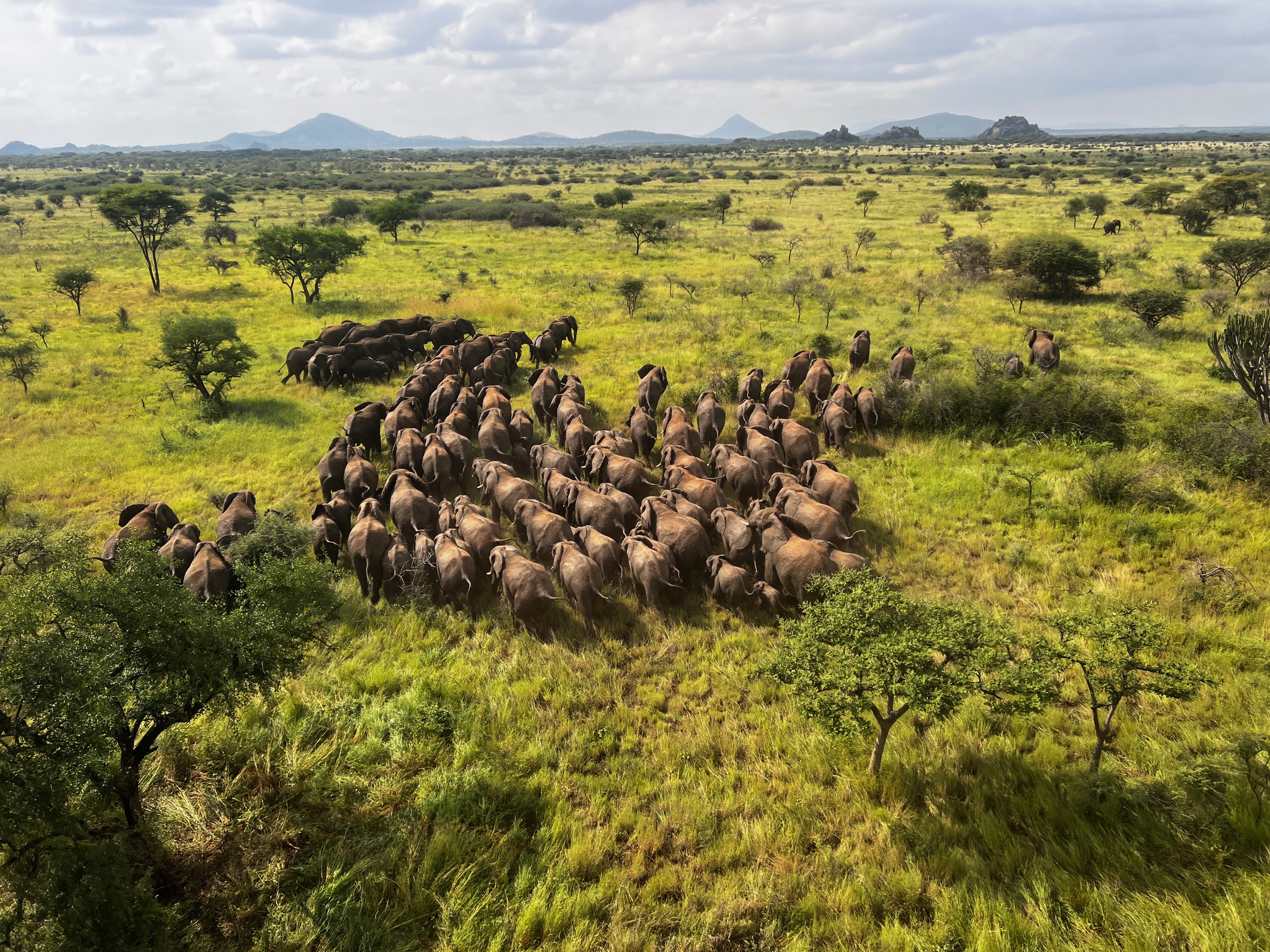 Large herds were noted, with groups of 100 to 200 elephants spotted across the landscape.